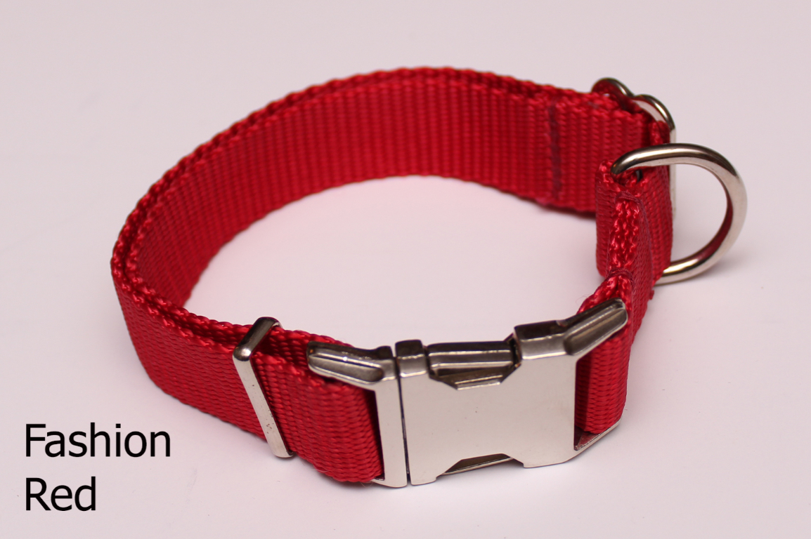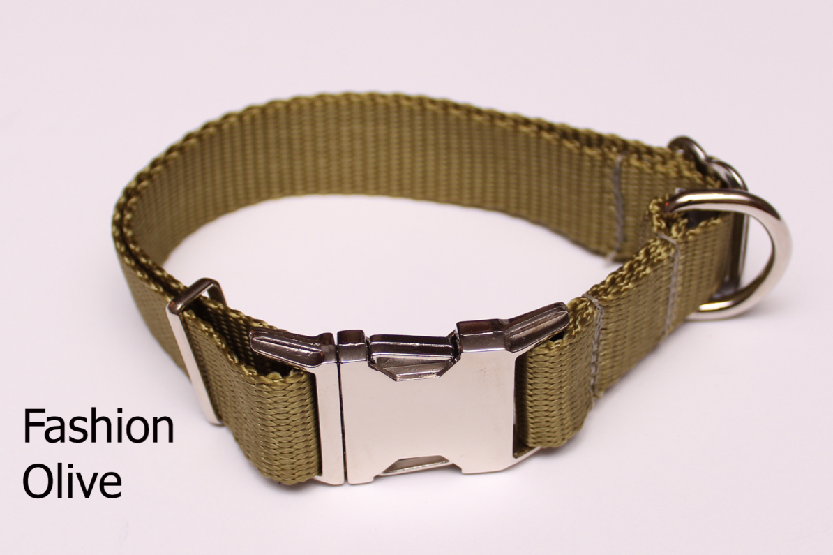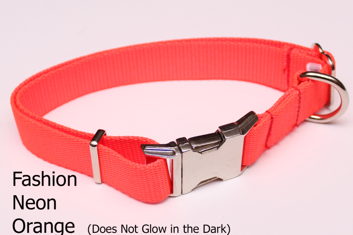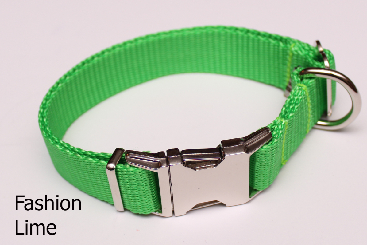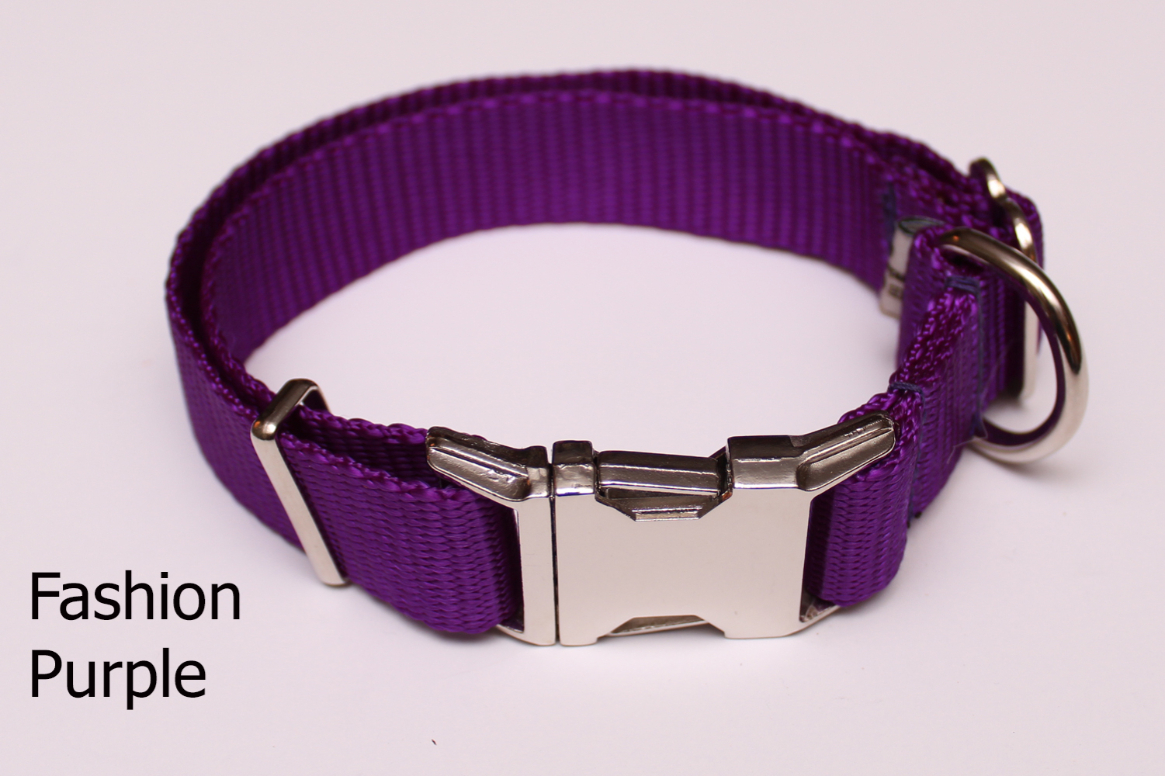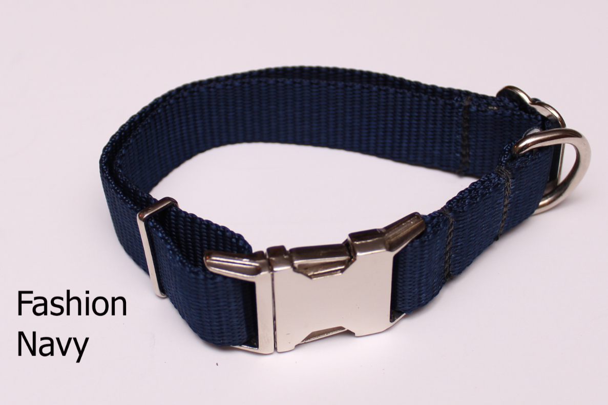 Long-lasting dog collars are hard to come by with the exception of the collection of quality dog collars found in the Standard Collar Fashion Series. The dog collars in this collection are made in the USA using the finest materials, including heavy-duty, nickel-plated steel and 1-inch nylon with a tensile strength of 6000 lbs. Choose from different colors including black, brown, burnt orange, hot pink, hunter, lime, mellow yellow, navy, neon orange, neon yellow, olive, purple, red, royal, and silver.