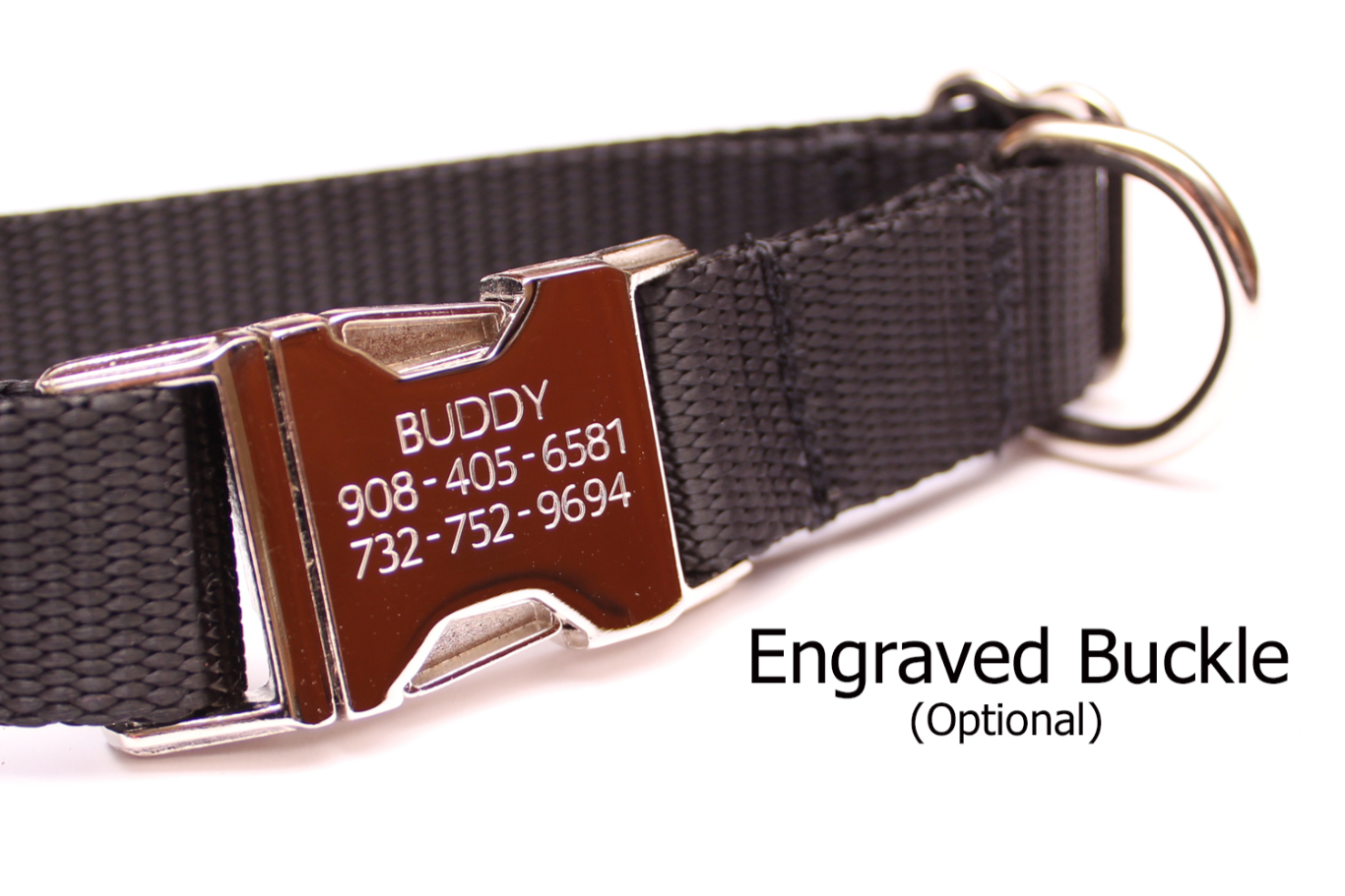 - Collar buckle can be engraved with your dog’s name and two phone numbers